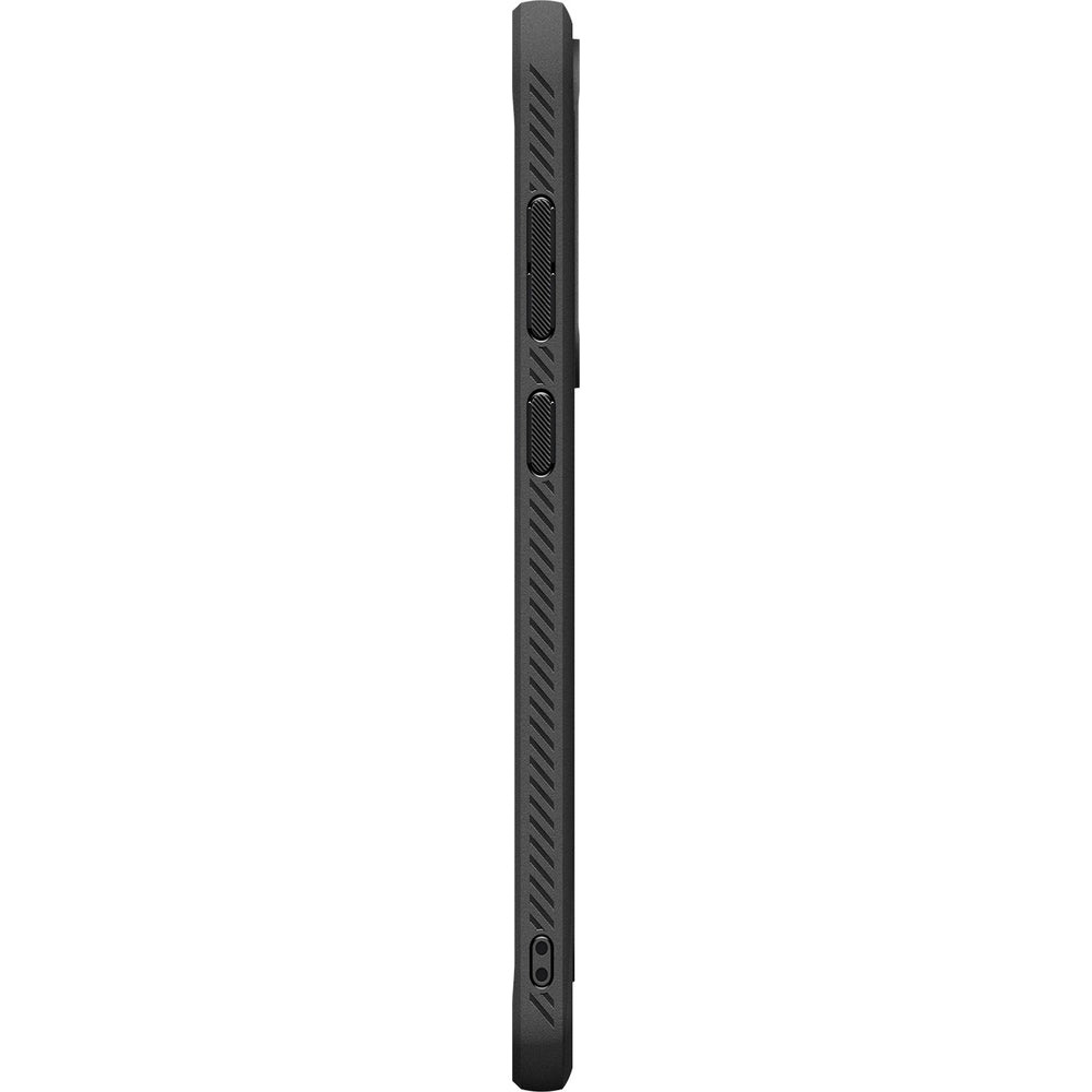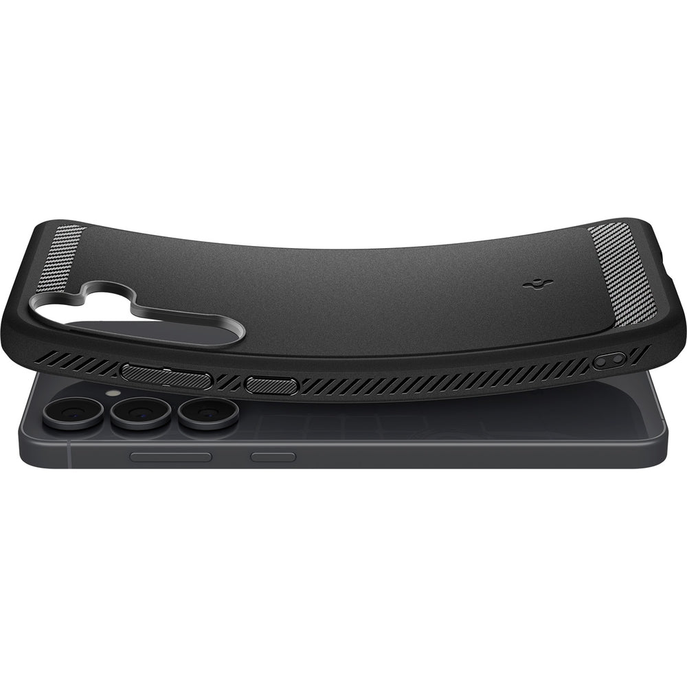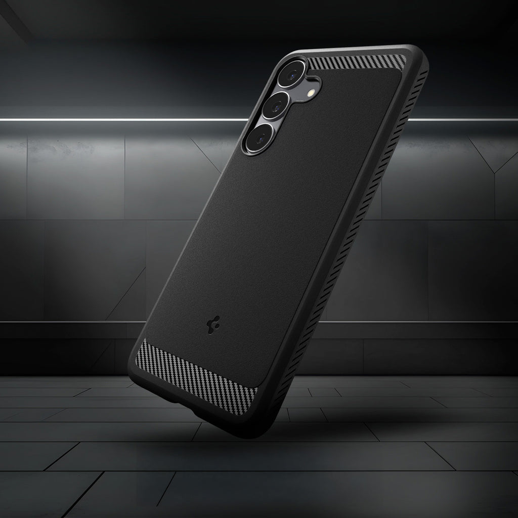 Die Original-Hülle von Spigen aus der Rugged Armor-Serie ist eine der beliebtesten Entscheidungen unter den Käufern, mit großartigen Bewertungen unter den Nutzern. Die Hülle besteht aus flexiblem Thermopolyurethan und bietet hervorragenden Schutz im täglichen Gebrauch. Die matte Oberfläche mit spezieller Textur an den Seiten bietet eine gute Griffigkeit, und das minimalistische und schlanke Design wird durch stilvolle Akzente im Karbon-Stil aufgewertet.