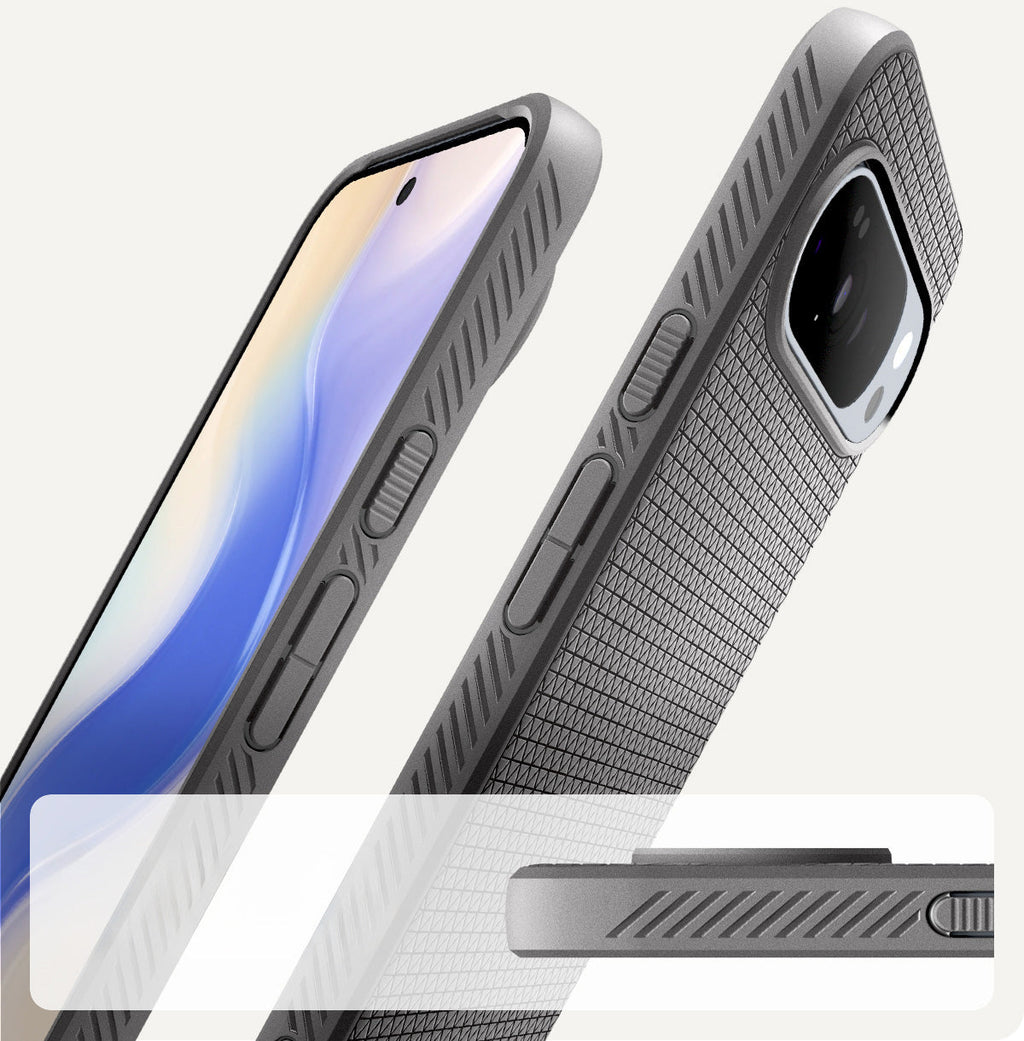 Die modische Liquid Air Mag-Hülle von Spigen verfügt über ein einzigartiges, feines geometrisches Muster auf der Rückseite, das die gesamte Hülle stilvoll aussehen lässt und gleichzeitig die Gefahr von Fingerabdrücken verringert. Die Hülle besteht aus flexiblem Thermopolyurethan und bietet hervorragenden Schutz für den täglichen Gebrauch. Es ist leicht, schlank und elegant, ohne aufzutragen, und die matte Oberfläche mit spezieller Textur an den Seiten bietet einen guten Halt, sodass es gut in der Hand liegt.
