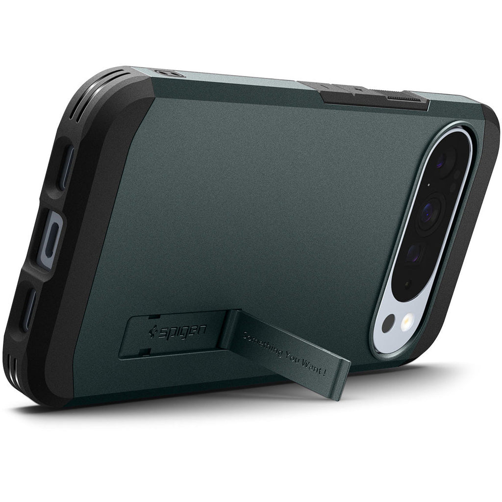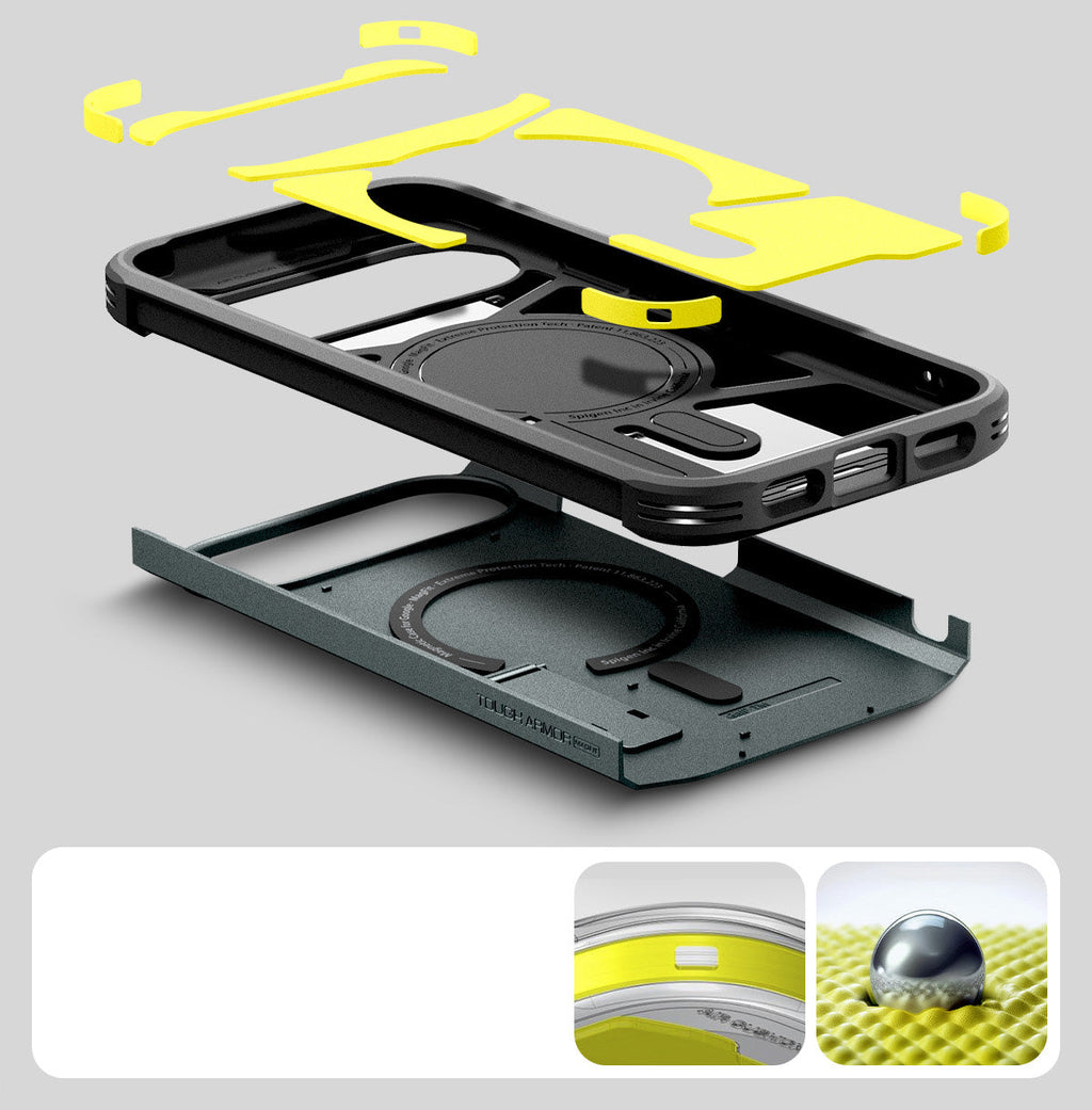 Ein großartiges Produkt aus der Tough Armor Mag-Serie von Spigen, das sich durch hohe Strapazierfähigkeit auszeichnet und dank des eingebauten Magnetrings, der das Hülle mit dem MagSafe-Zubehör kompatibel macht, sehr komfortabel ist. Darüber hinaus ermöglicht der integrierte KickStand im ausgeklappten Zustand eine horizontale Positionierung des Telefons, um das Surfen in den Medien komfortabler zu gestalten.