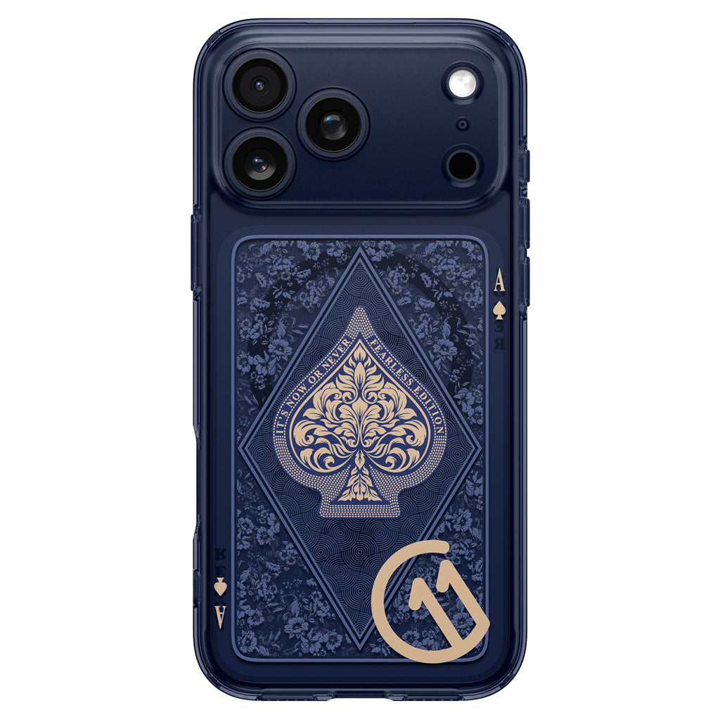 Auf der Innenseite des Etuis ist der Joker abgebildet, während die Rückseite mit einem stilvollen Pik-As-Motiv verziert ist.
