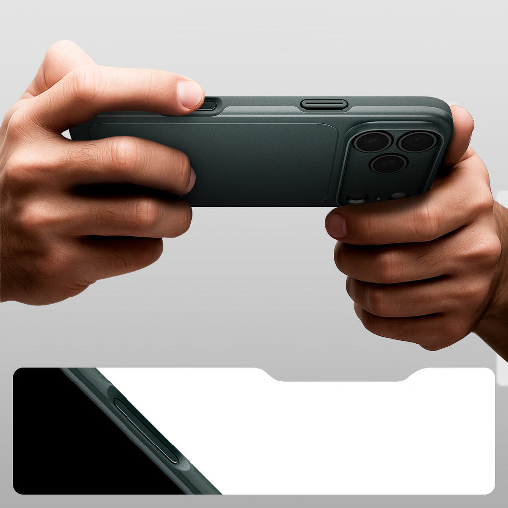 Die Thin Fit Mag-Hybridhülle von Spigen ist eine der dünneren und leichteren Hüllen des Unternehmens, die so konzipiert ist, dass sie Ihr Gerät nicht unnötig aufbläht. Das Gehäuse besteht aus einer Kombination aus Thermopolyurethan und Polycarbonat, so dass es trotz des schlanken Designs einen wirksamen Schutz vor Kratzern und Schmutz im täglichen Gebrauch bietet. Das ergonomische Design sorgt dafür, dass das Ganze gut in der Hand liegt und einen bequemen und sicheren Griff bietet. Dies ist eine großartige Hülle für alle, die ein minimalistisches und asketisches Design schätzen. Dank des integrierten Magnetrings ist die Hülle mit dem MagSafe-Zubehör kompatibel.