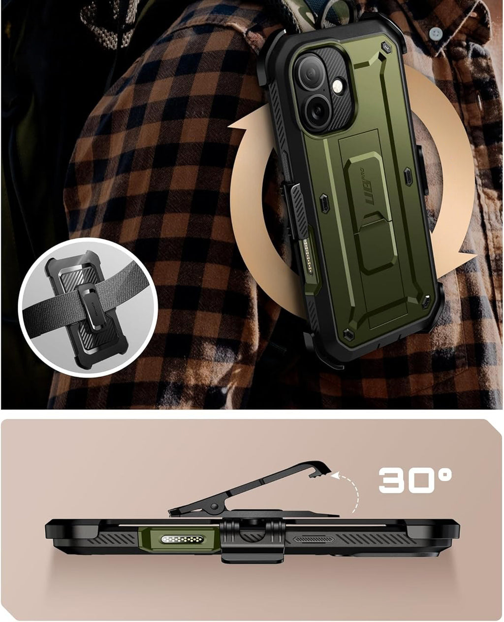 Das Set enthält ein Holster mit einem drehbaren Holster, das für zusätzliche Funktionalität und größere Widerstandsfähigkeit sorgt. Dies ist eine großartige Ergänzung, wenn die Situation volle Bewegungsfreiheit und freie Hände erfordert und Sie Ihr Telefon immer bei sich haben müssen. Einfach das Holster z. B. am Gürtel befestigen und das Basisgehäuse mit dem Bildschirm nach innen hineinlegen - fertig.