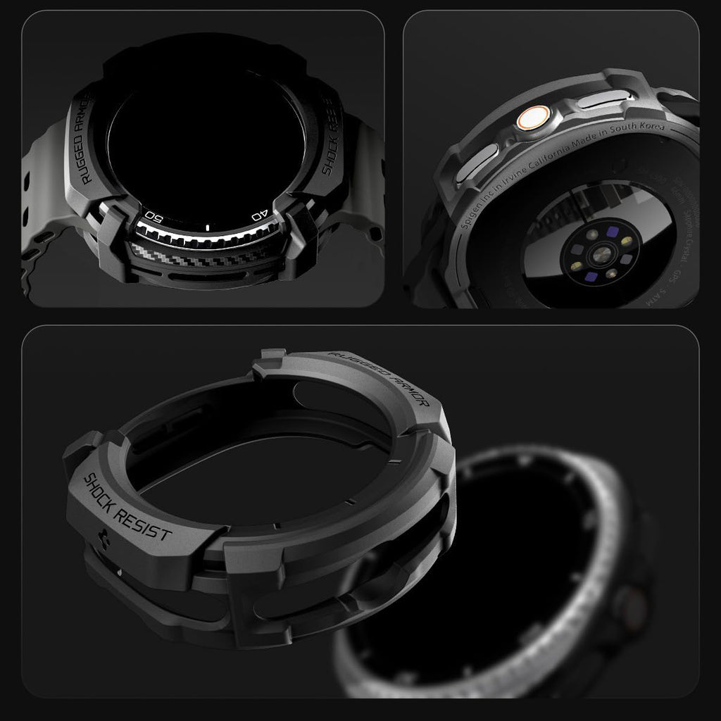 Spigen Rugged Armor ist ein großartiger Schutz für Ihre Smartwatch. Das Gehäuse ist in einem gepanzerten Stil mit raffinierten Details gestaltet, die das Karbonfasermuster imitieren, was den Schnitt Ihrer Uhr in ein charaktervolles und dominantes Design verwandelt.