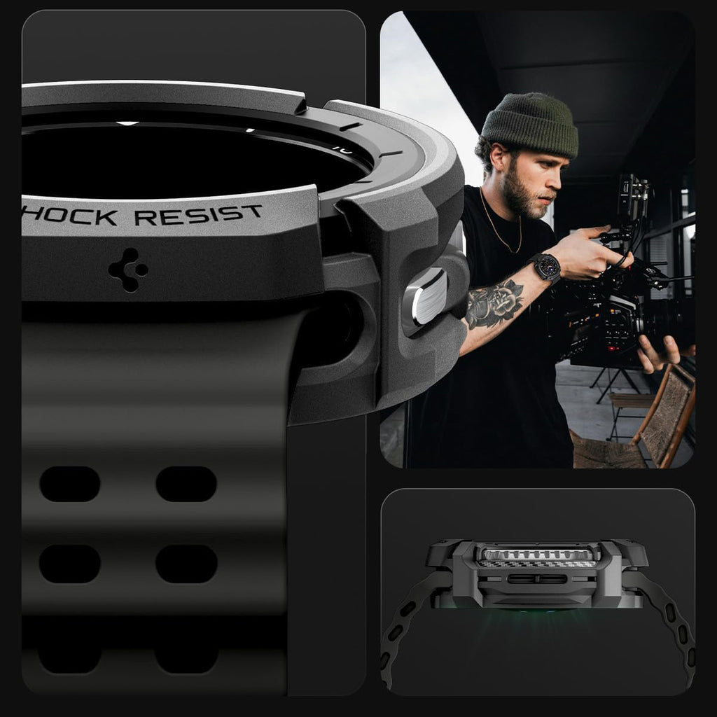 Die Original-Hülle von Spigen aus der Rugged Armor-Serie ist aus hochwertigem, weichem, thermoplastischem Polyurethan gefertigt und bietet hohen Schutz vor Kratzern und Stößen. Die sorgfältige Verarbeitung liegt gut in der Hand, und das gepanzerte Design zusammen mit den feinen karbonähnlichen Akzenten wird das Aussehen Ihrer Smartwatch definitiv verändern.