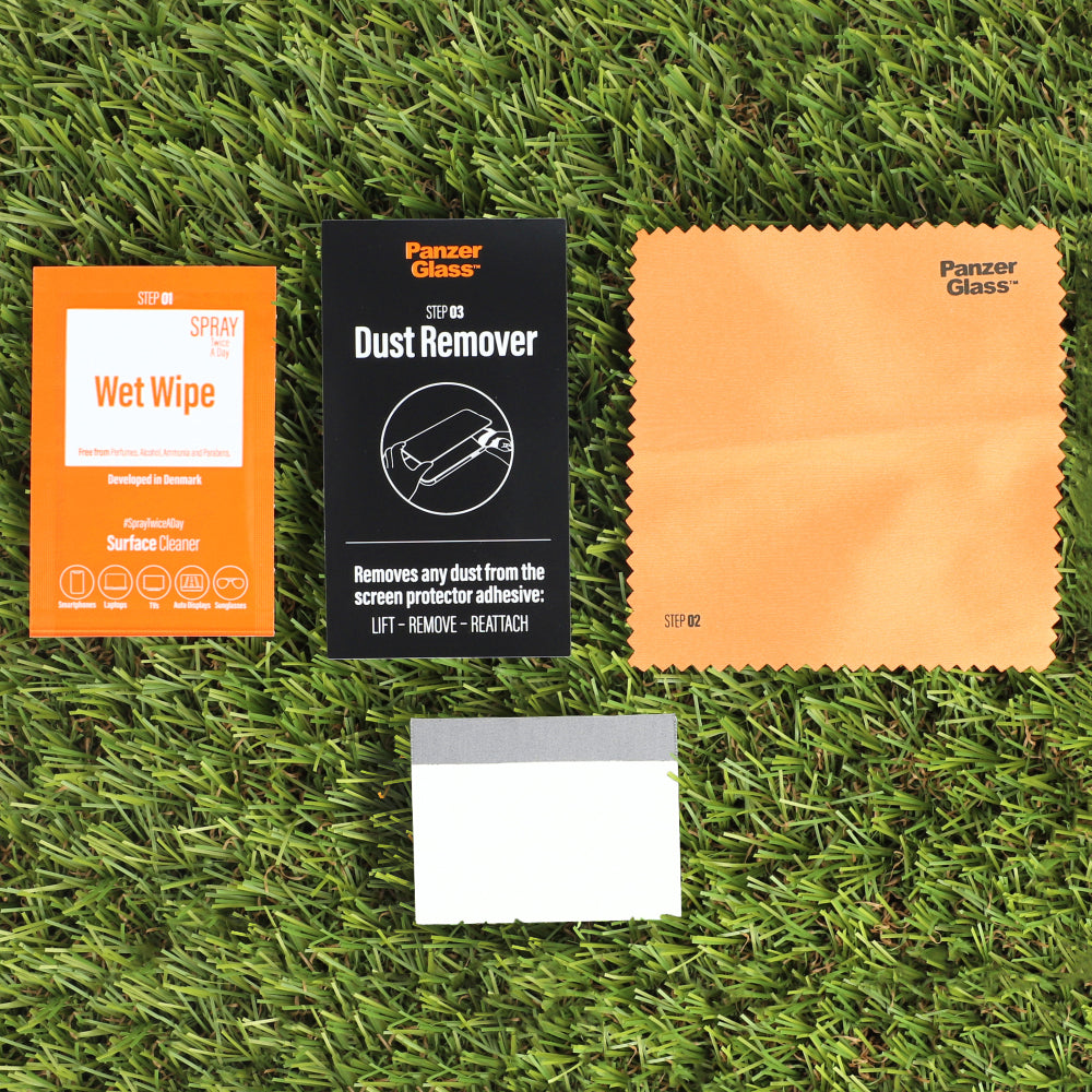 Das PanzerGlass Ultra-Wide Fit TPU + Classic Fit Glass Kit, neben dem 1 Stück gehärteten Glas und 1 Stück Folie, enthält ein feuchtes Tuch (01), ein trockenes Mikrofasertuch (02), einen Anti-Kratz-Aufkleber (03) und ein Squeegee Karte.