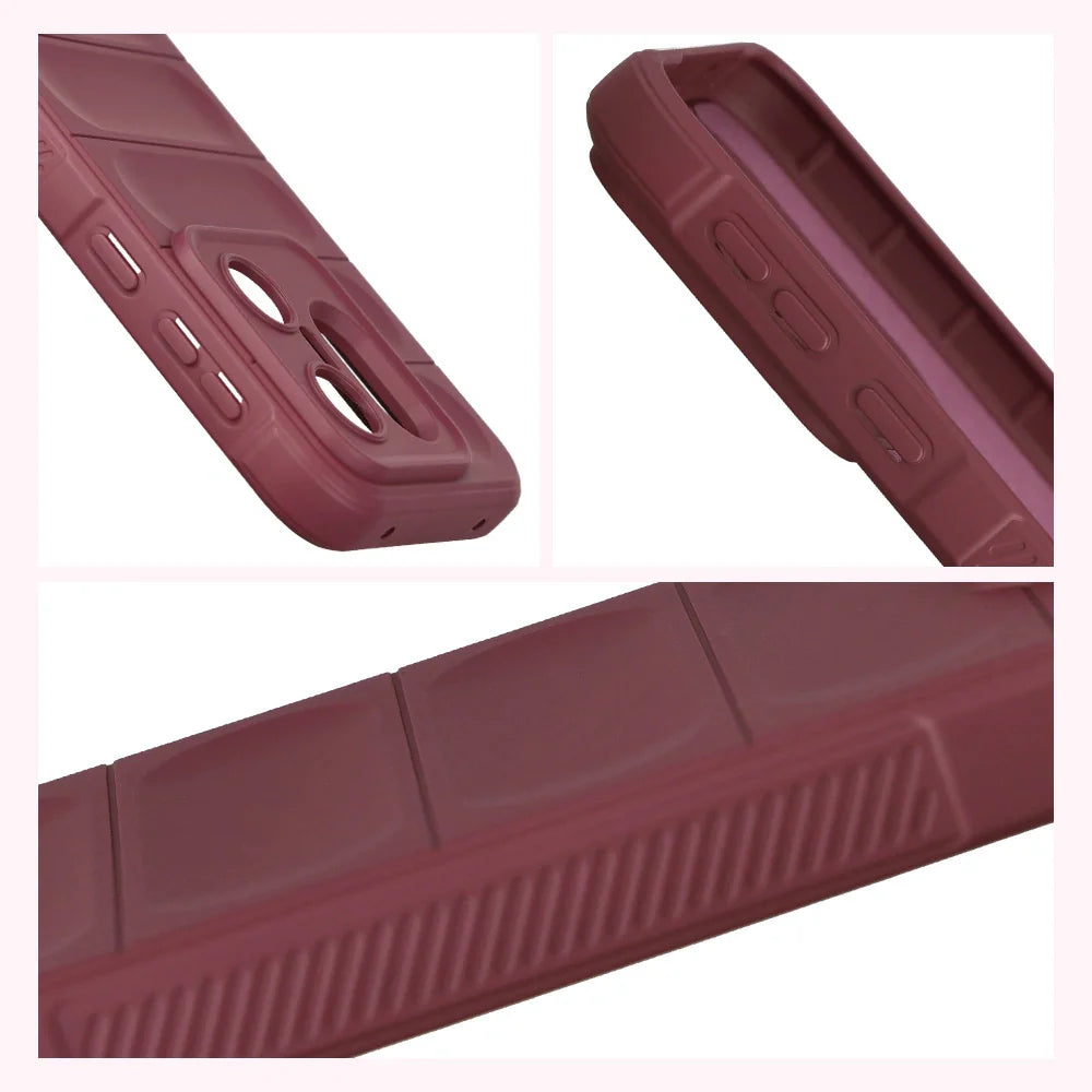 Die Handyhülle wurde mit Blick auf eine bessere Griff entwickelt. Die strukturierten Seiten ermöglichen es Ihnen, das Gerät sicherer und stabiler zu halten, und sollten Sie es unglücklich fallen lassen, so dass das Display nach unten zeigt, verhindern die erhöhten Ränder, dass es direkt auf dem Boden aufschlägt! Die erhöhten Ränder befinden sich auch um die Kamerainsel, die in Kombination mit den speziellen Objektivausschnitten einen doppelten Schutz für die Kamera bietet.