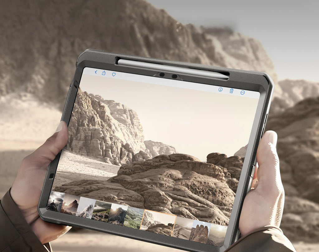Ein speziell entwickelter Steckplatz für den Apple Stylus ermöglicht es, ihn zusammen mit dem Tablet in der Tasche aufzubewahren, sodass er immer zur Hand ist.